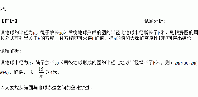 如果用一根很长的绳子沿着地球赤道绕1圈,然后把绳子放长30m,想象一下,高度为4米的大象能否从绳圈与地球赤道之间的缝隙穿过?