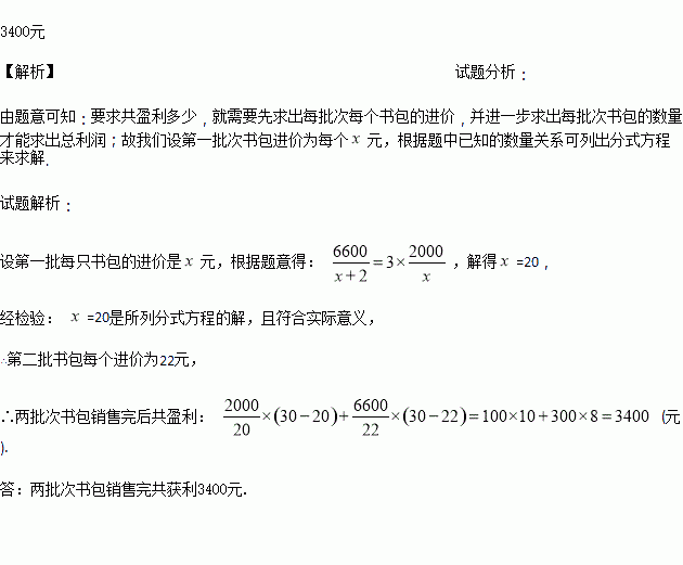 某文化用品商店用2000元购进一批小学生书包,面市后发现供不应求,商店又购进第二批同样的书包,所购数量是第一批购进数量的3倍,但单价贵了2元,结果第二批用了6600元.若商店销售这两批书包时,每个售价都是30元,全部售出后,商店共盈利多少元?
