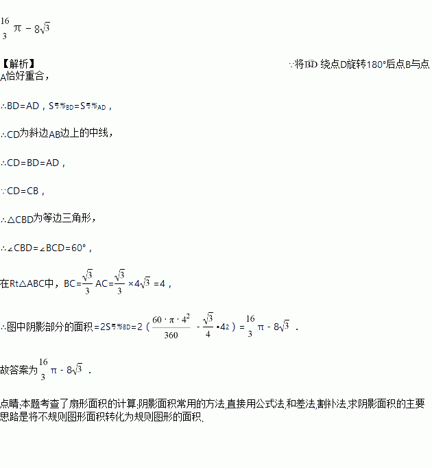如图,在Rt△ABC中,∠ACB=90°,AC=4,以点C为圆心,CB的长为半径画弧,与AB边交于点D,将绕点D旋转180°后点B与点A恰好重合,则图中阴影部分的面积为_____.