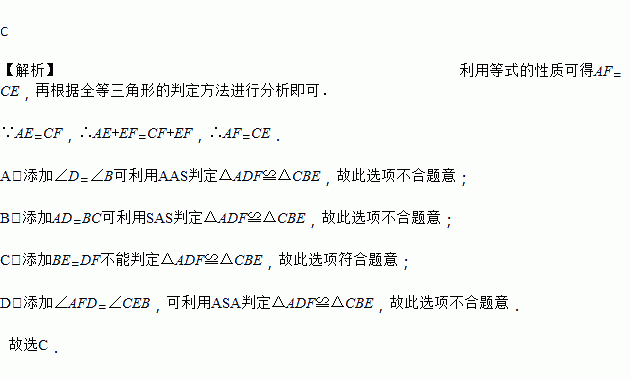 如图,已知AE=CF,∠A=∠C,那么添加下列一个条件后,仍无法判定△ADF≌△CBE的是( )