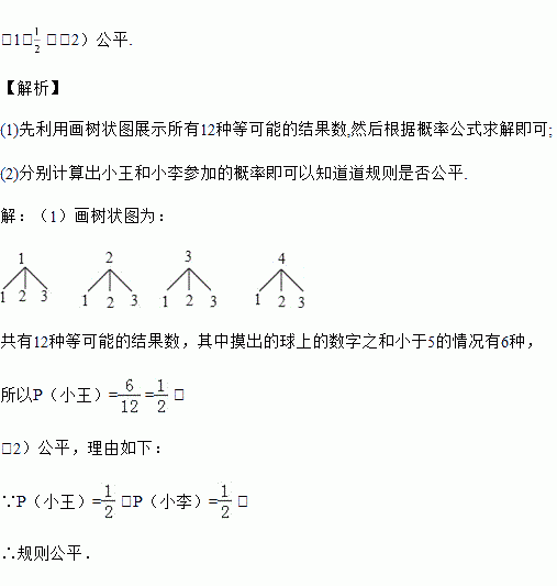 在两个盒子内分别装入标有数字1,2,3,4的四个标有数字1,2,3的三个完全相同的小球,分别从两个盒子中各摸出一个球,如果所摸出的球上的数字之和小于5,那么小王去参加,否则就是小李去参加.