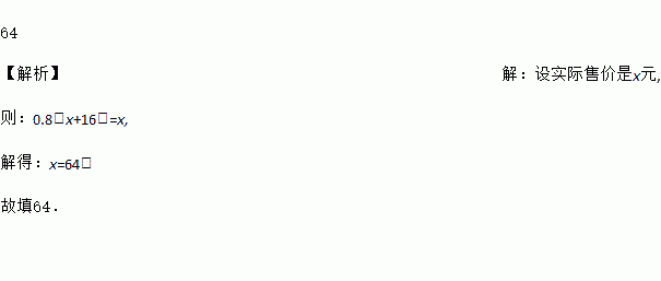 “红星”商场对商品进行清仓处理,全场商品一律八折,小亮在该商场购买了一双运动鞋,比按原价购买该鞋节省了16元,他购买该鞋实际用_____元.