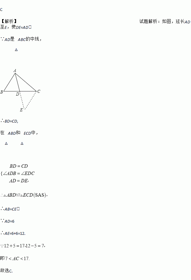 在△ABC中,AB=5,中线AD=6,则边AC的取值范围是( )