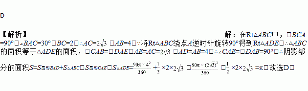 如图,在Rt△ABC中,∠BCA=90°,∠BAC=30°,BC=2,将Rt△ABC绕A点顺时针旋转90°得到Rt△ADE,则BC扫过的面积为( )