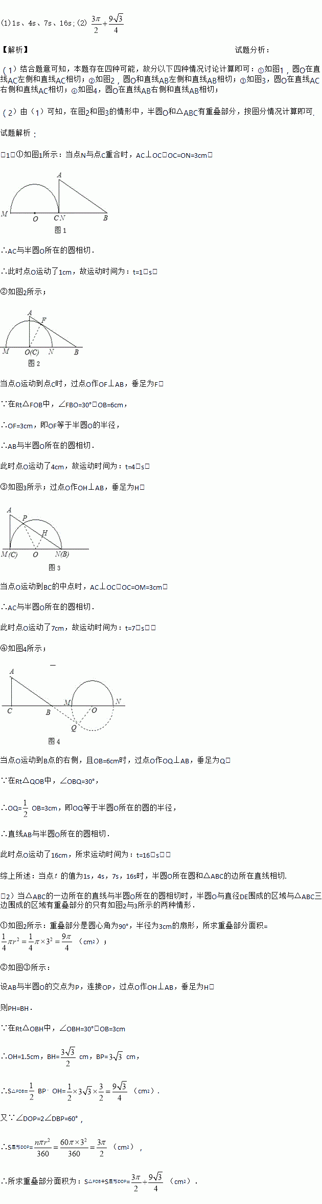 (1)1s、4s、7s、16s;(2) 【解析】试题分析: (1)结合题意可知,本题存在四种可能,故分以下四种情况讨论计算即可:①如图1,圆O在直线AC左侧和直线AC相切;②如图2,圆O和直线AB左侧和直线AB相切;③如图3,圆O在直线AC右侧和直线AC相切;④如图4,圆O在直线AB右侧和直线AB相切; (2)由(1)可知,在图2和图3的情形中,半圆O和△ABC有重叠部分,按图分...如图所示:在平面直角坐标系中,四边形OACB为矩形,C点坐标为(3,6),若点P从O点沿OA向A点以1cm/s的速度运动,点Q从A点沿AC以2cm/s的速度运动,如果P、Q分别从O、A同时出发,问: