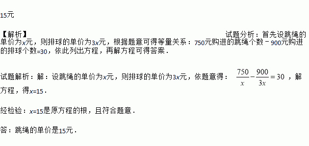 15元 【解析】试题分析:首先设跳绳的单价为x元,则排球的单价为3x元,根据题意可得等量关系:750元购进的跳绳个数﹣900元购进的排球个数=30,依此列出方程,再解方程可得答案. 试题解析:【解析】 设跳绳的单价为x元,则排球的单价为3x元,依题意得: ,解方程,得x=15. 经检验:x=15是原方程的根,且符合题意. 答:跳绳的单价是15元.