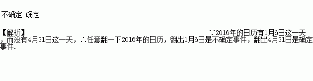 任意翻一下2016年的日历,翻出1月6日是______________事件,翻出4月31日是_____________事件.(填“确定”或“不确定”)