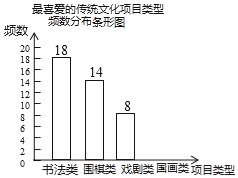 某校为更好地开展“传统文化进校园”活动,随机抽查了部分学生,了解他们最喜爱的传统文化项目类型(分为书法、围棋、戏剧、国画共4类),并将统计结果绘制成如图不完整的频数分布表及频数分布条形图.