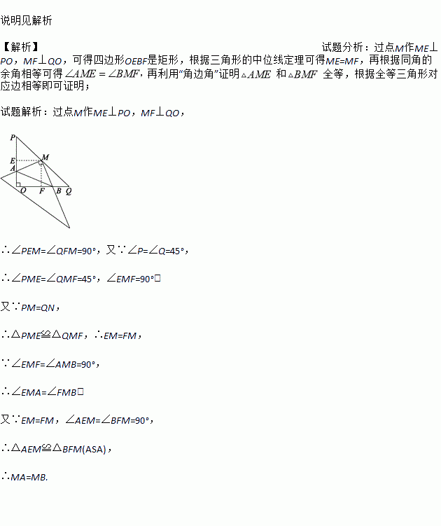 Èçͼ£¬ÔÚRt¡÷POQÖУ¬OP=OQ=4£¬MÊÇPQÖе㣬¡ÏP=¡ÏQ=45¡ã£¬½«Ò»Èý½Ç³ßµÄÖ±½Ç¶¥µã·ÅÔÚµãM´¦£¬ÒÔMΪÐýתÖÐÐÄÐýתÈý½Ç³ß£¬Èý½Ç³ßµÄÁ½Ö±½Ç±ßÓë¡÷POQµÄÁ½Ö±½Ç±ß·Ö±ð½»ÓÚµãA¡¢B.ÊÔ˵Ã÷£ºMA=MB.