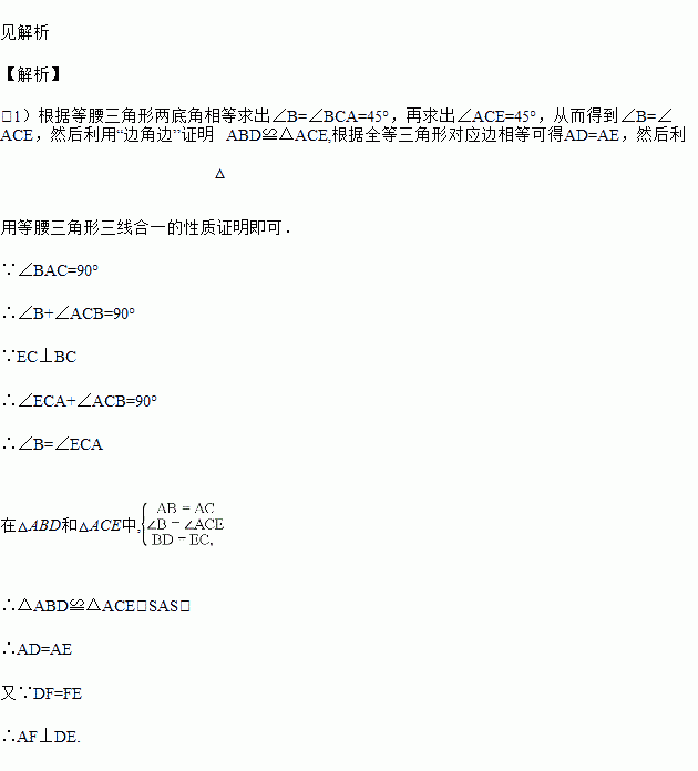 已知:如图,在△ABC中,AB=AC,∠BAC=90°,D为BC上一点,EC⊥BC,EC=BD,DF=FE, 求证:AF⊥DE