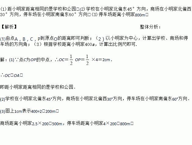 如图是小明家和学校所在地的简单地图,已知OA=2cm,OB=2.5cm,OP=4cm,点C为OP的中点,回答下列问题: