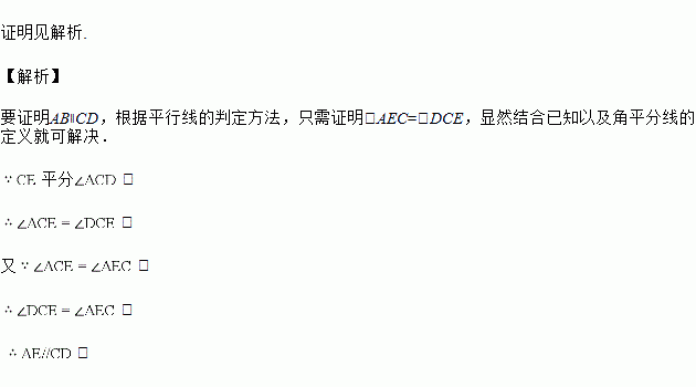 如图,已知点E在AB上,CE平分∠ACD,∠ACE=∠AEC.求证:AB∥CD.