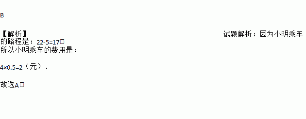 B 【解析】试题解析:因为小明乘车的路程是:22-5=17, 所以小明乘车的费用是: 4×0.5=2(元). 故选A.