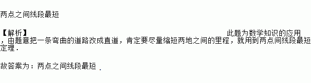 两点之间线段最短 【解析】此题为数学知识的应用,由题意把一条弯曲的道路改成直道,肯定要尽量缩短两地之间的里程,就用到两点间线段最短定理. 故答案为:两点之间线段最短.