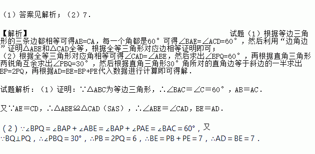 如图,△ABC为等边三角形,AE=CD,AD,BE相交于点P,BQ⊥AD于Q,PQ=3,PE=1.