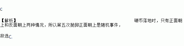 C 【解析】硬币落地时,只有正面朝上和反面朝上两种情况,所以第五次抛掷正面朝上是随机事件, 故选C.