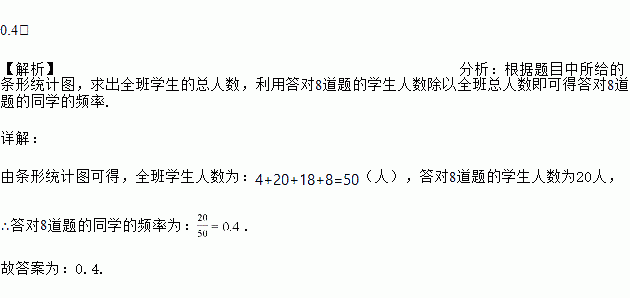 数学老师布置10道选择题作为课堂练习,学习委员将全班同学的答题情况绘制成条形图,根据统计图可知,答对8道题的同学的频率是_______.