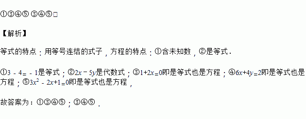已知式子:①3–4=–1;②2x–5y;③1+2x=0;④6x+4y=2;⑤3x2–2x+1=0,其中是等式的有__________,是方程的有__________.