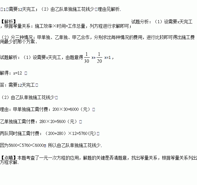 (2)又知甲队单独施工每天需付200元施工费,乙队单独施工每天需付280元施工费,那么是由甲队单独施工,还是由乙队单独施工,还是由两队同时施工?请你按照少花钱多办事的原则,设计一个方案,并通过计算说明理由.