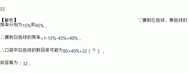 在一个透明的布袋中,红色、黑色、白色的玻璃球共有80个,它们除颜色外其他完全相同,小李通过多次摸球试验后,发现其中摸到红色球、黑色球的频率分别为15%和45%,则口袋中白色球的数目很可能是________个.