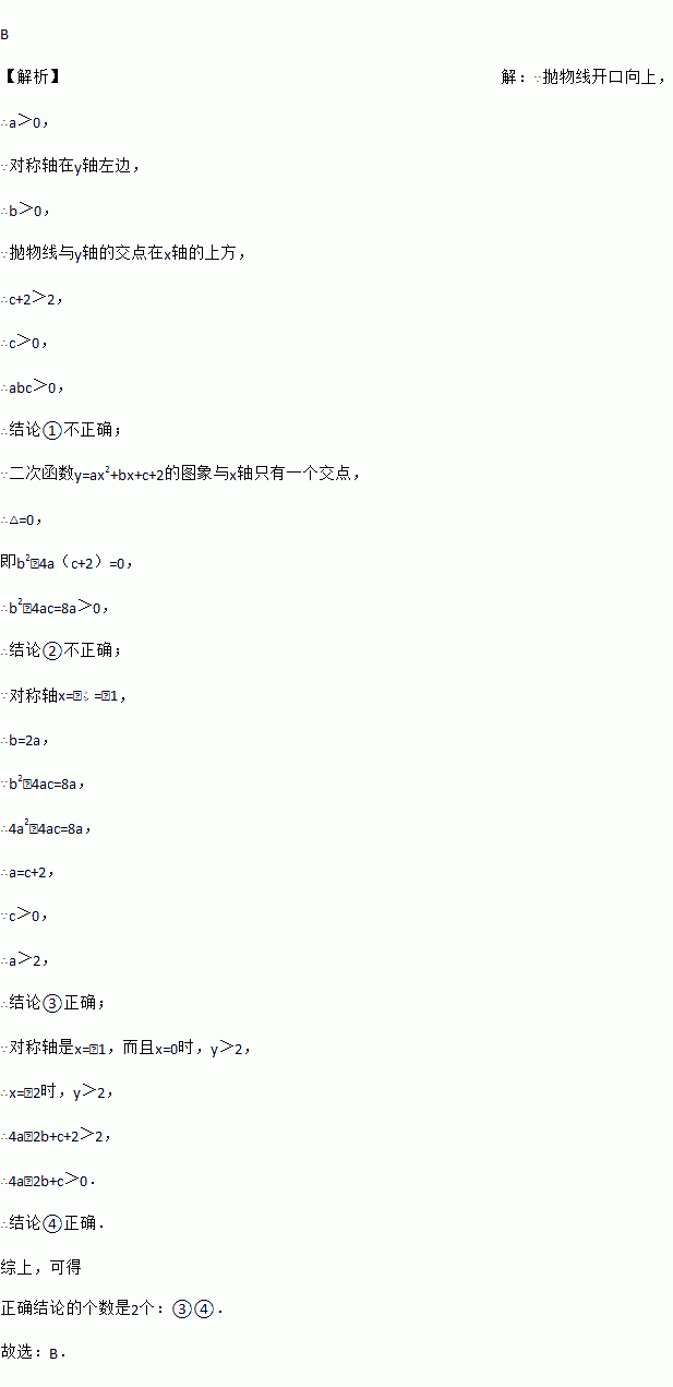 B 【解析】【解析】 ∵抛物线开口向上, ∴a>0, ∵对称轴在y轴左边, ∴b>0, ∵抛物线与y轴的交点在x轴的上方, ∴c+2>2, ∴c>0, ∴abc>0, ∴结论①不正确; ∵二次函数y=ax2+bx+c+2的图象与x轴只有一个交点, ∴△=0, 即b2﹣4a(c+2)=0, ∴b2﹣4ac=8a>0, ...