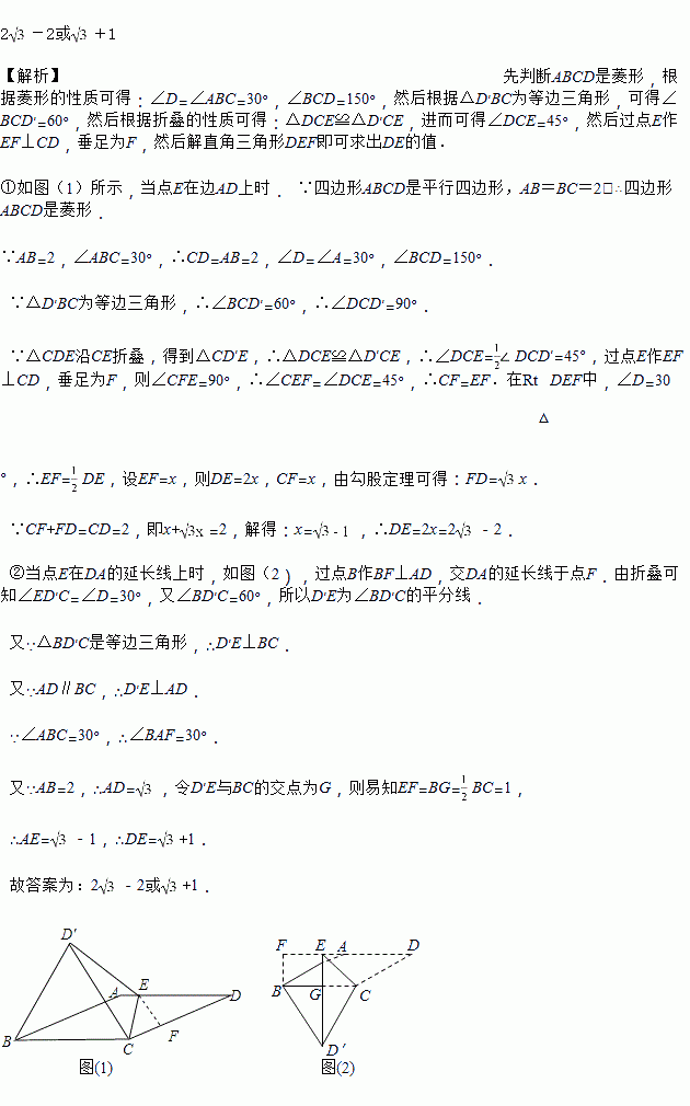 如图,四边形ABCD是平行四边形,AB=BC=2,∠ABC=30°,点E是射线DA上一动点,把△CDE沿CE折叠,点D的对应点为D′,连接D′B.若△D′BC为等边三角形,则DE=____________.