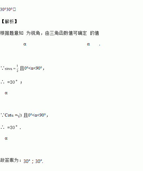 已知0°<α<90°,当α=__________时,,当α=__________时,Cot=.