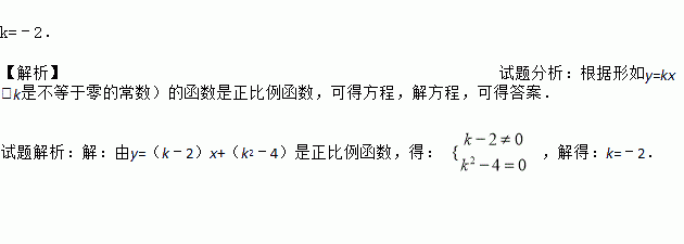 k=﹣2. 【解析】试题分析:根据形如y=kx(k是不等于零的常数)的函数是正比例函数,可得方程,解方程,可得答案. 试题解析:【解析】 由y=(k﹣2)x+(k2﹣4)是正比例函数,得: ,解得:k=﹣2.