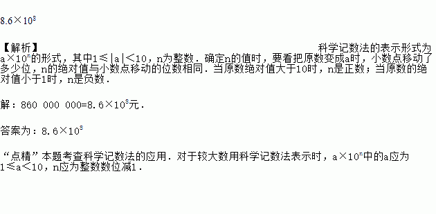 据媒体报道,我国因环境污染造成的巨大经济损失,每年高达860 000 000元,这个数用科学记数法表示为 元.