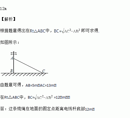 如图,从电线杆离地面5m处向地面拉一条长13m的缆绳,这条缆绳在地面的固定点距离电线杆底部有多远?