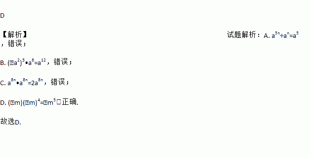 D 【解析】试题解析:A. a5n÷an=a5 ,错误; B. (﹣a2)3•a6=a12,错误; C. a8n•a8n=2a8n,错误; D. (﹣m)(﹣m)4=﹣m5,正确. 故选D.