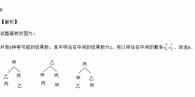 甲、乙、丙三人站成一排拍照,则甲站在中间的概率是( )