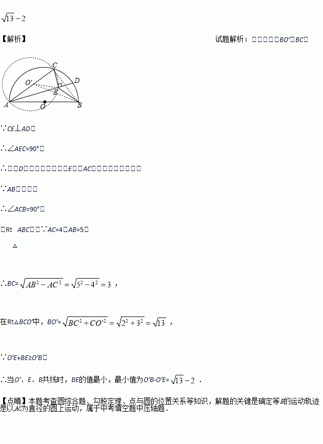 如图, 是半⊙的直径,点在半⊙上, =5 cm, =4 cm. 是弧BC上的一个动点,连接,过点作于,连接.在点移动的过程中, 的最小值为_____.