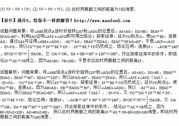 (问题背景)如图1,在四边形ABCD中,AB=AD,∠BAD=120°,∠B=∠ADC=90°,且∠EAF=60°,探究图中线段BE,EF,FD之间的数量关系.小明同学的方法是将△ABE绕点A逆时针旋转120°到△ADG的位置,然后再证明△AFE ≌△AFG,从而得出什么结论.