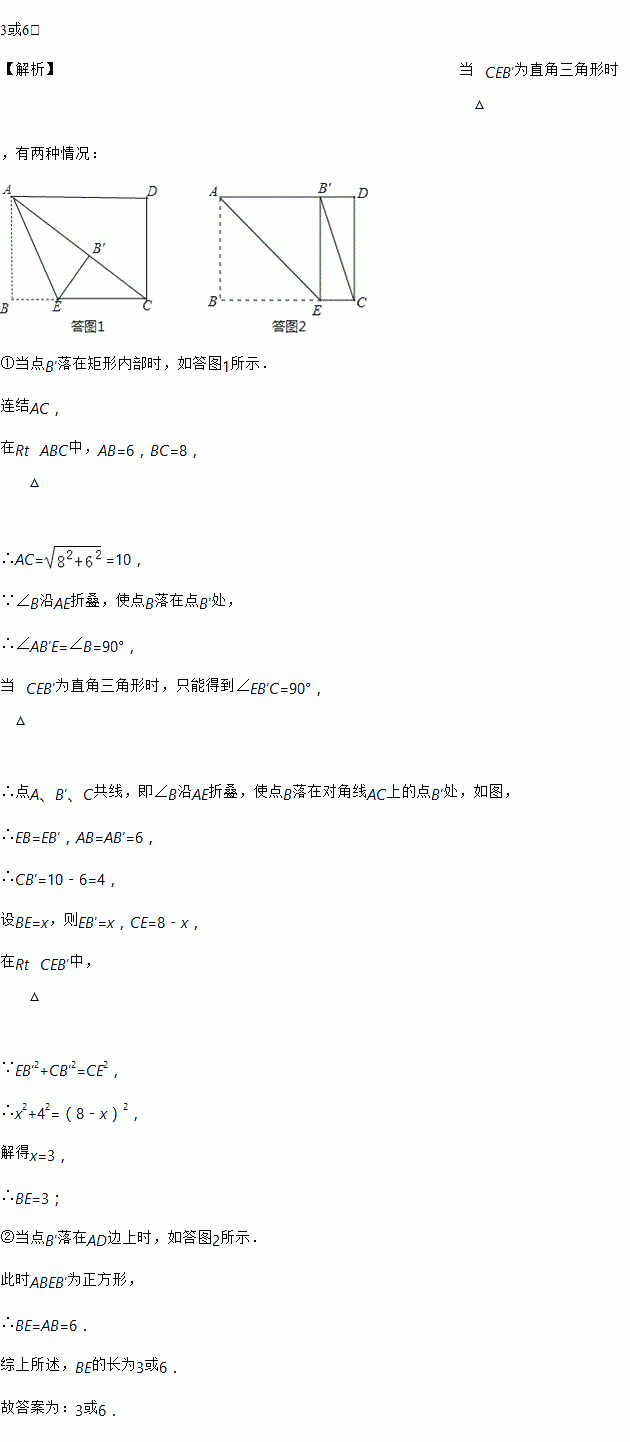 如图,矩形ABCD中,AB=6,BC=8,点E是BC边上一点,连接AE,把∠B沿AE折叠,使点B落在点B′处,当△CEB′为直角三角形时,BE的长为 .