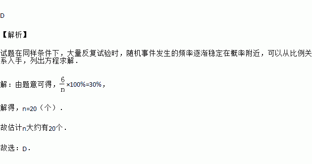 一个不透明的盒子里有n个除颜色外其它完全相同的小球,其中有6个黄球.每次摸球前先将盒子里的球摇匀,任意摸出一个球记下颜色后在放回盒子,通过大量重复摸球实验后发现,摸到黄球的频率稳定在30%,那么可以推算出n大约是( )