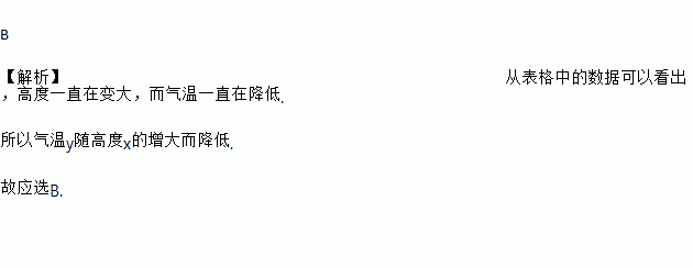 B 【解析】从表格中的数据可以看出,高度一直在变大,而气温一直在降低. 所以气温y随高度x的增大而降低. 故应选B.