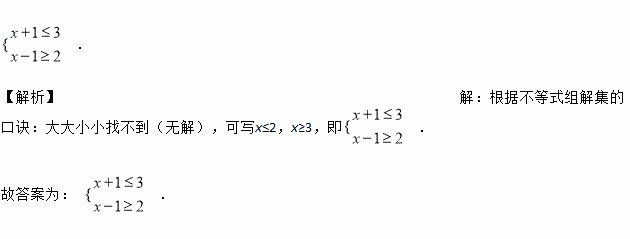 . 【解析】【解析】 根据不等式组解集的口诀:大大小小找不到(无解),可写x≤2,x≥3,即. 故答案为: .