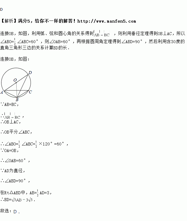 如图,△ABC内接于⊙O,AB=BC,∠ABC=120°,⊙O的直径AD=6,则BD的长为( )
