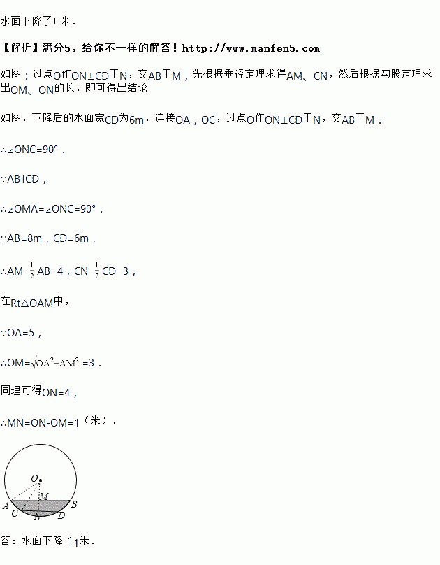 一圆柱形排水管的截面如图所示,已知排水管的半径为,水面宽为.由于天气干燥,水管水面下降,此时排水管水面宽变为,求水面下降的高度.