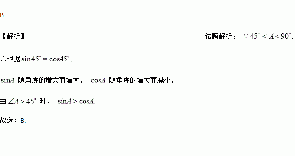 A. sinA=cosA B. sinA>cosA C. sinA>tanA D. sinA<cosA