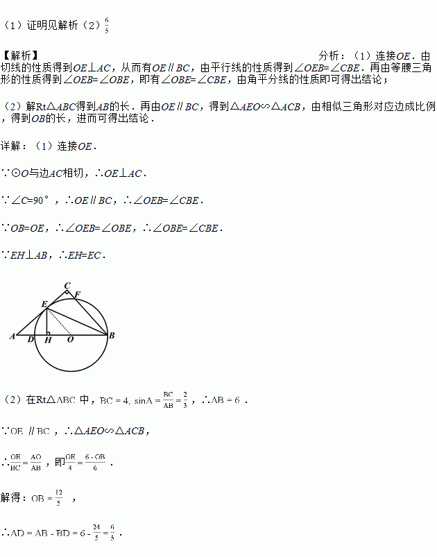 如图,在△中,∠,点是边上一点,以为直径的⊙与边相切于点,与边交于点,过点作⊥于点,连接.