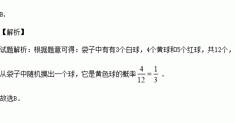 一个不透明的袋子中有3个白球,4个黄球和5个红球,这些球除颜色不同外,其他完全相同.从袋子中随机摸出一个球,则它是黄球的概率是( )