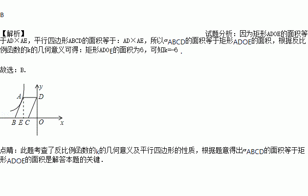 (x<0)的图象上的一点,过点A作平行四边形ABCD,使点B、C在x轴上,点D在y轴上.已知平行四边形ABCD的面积为6,则k的值为( )