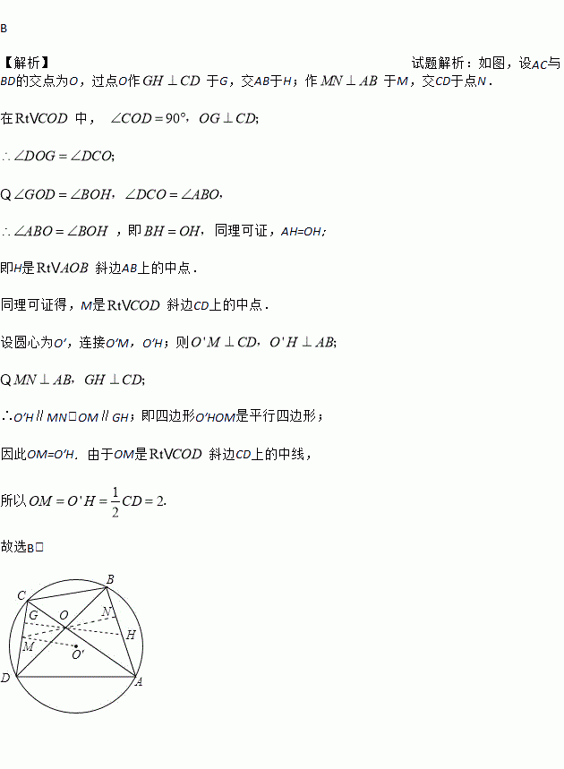 已知:圆内接四边形ABCD中,对角线AC⊥BD,AB>CD.若CD=4,则AB的弦心距为( )