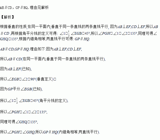 如图,AB⊥EF于点G,CD⊥EF于点H,GP平分∠EGB,HQ平分∠CHF,图中有哪些平行线?并说明理由.