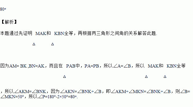 如图,在△PAB中,PA=PB,M、N、K分别是PA、PB、AB上的点,且AM= BK ,BN=AK.若∠MKN=50°,则∠P的度数为___________.