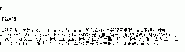 B 【解析】 试题分析:因为a=3,b=4,c=3,所以a=c,所以△ABC是等腰三角形,故A正确;因为a:b:c=2:3:4,所以a≠b≠c,所以△ABC不是等腰三角形,所以B错误;因为∠B=50°,∠C=80°,所以∠A=50°,所以∠A=∠B,所以△ABC是等腰三角形,所以C正确;因为∠A:∠B:∠C=1:1:2,所以∠A=∠B,所以△ABC是等腰三角形,所以D正确.故选:B. ...