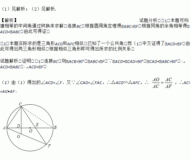 求证:(1)∠ACD=∠F; (2)AC2=AG·AF.