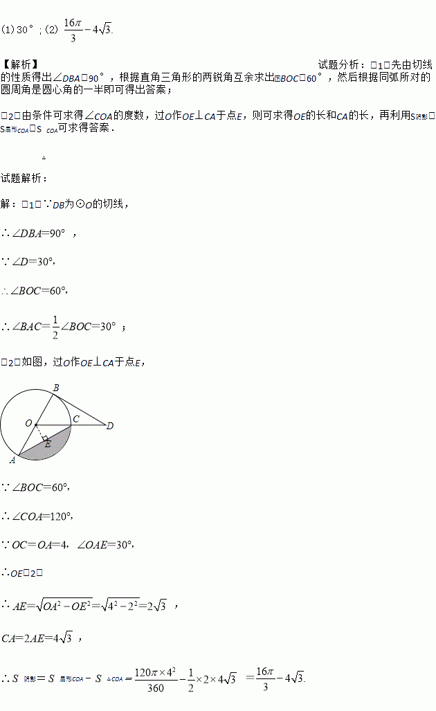 Èçͼ£¬BDÊÇ¡ÑOµÄÇÐÏߣ¬BΪÇе㣬Á¬½ÓDOÓë¡ÑO½»ÓÚµãC£¬ABΪ¡ÑOµÄÖ±¾¶£¬Á¬½ÓCA£¬Èô¡ÏD=30¡ã£¬¡ÑOµÄ°ë¾¶Îª4.